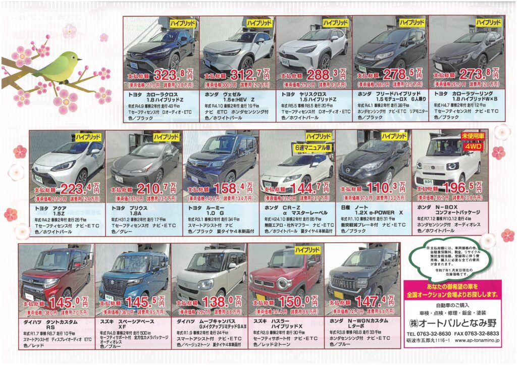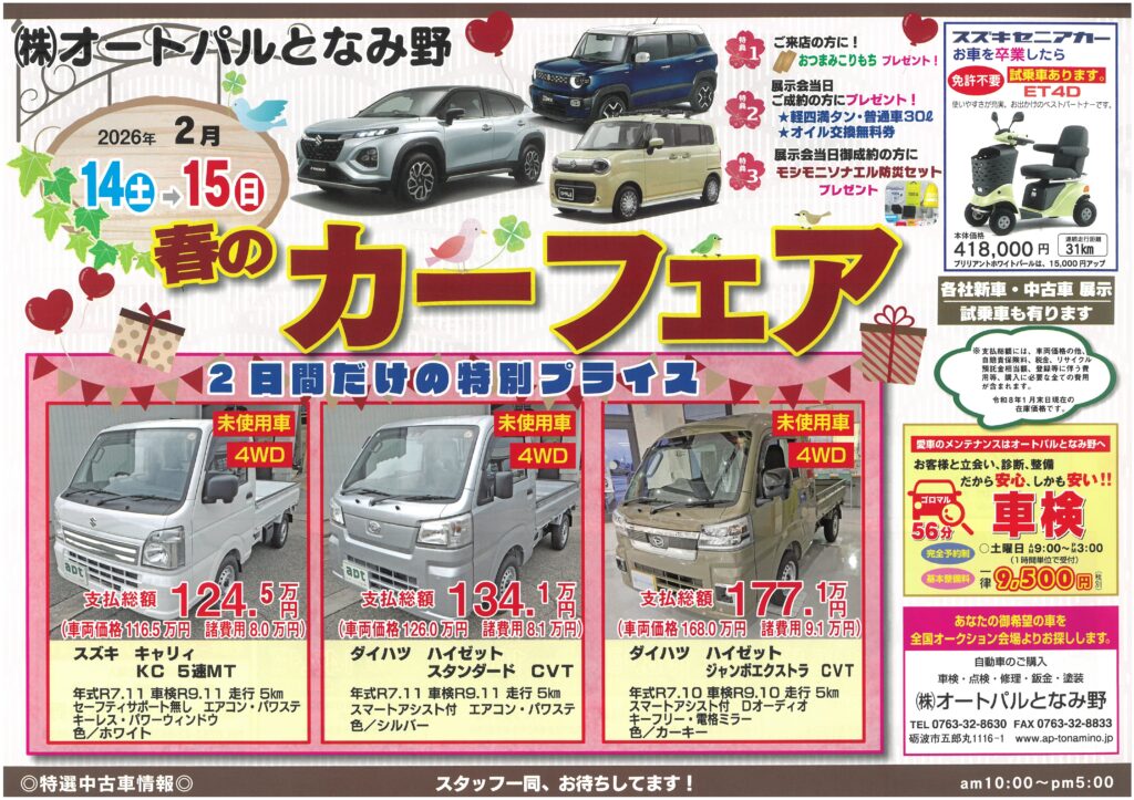 2026.02.6 2026.02.14 2月14~15日 春のカーフェア!新車&中古車展示会開催! いつもご覧いただきありがとうございます! 春のカーフェアを開催致します! 皆様のご来店をスタッフ一同心よりお待ちしております! 2月14(土)~15(日)展示会期間限定御成約特典! ◯ 展示会当日御成約者の方にプレゼント! ★ 軽四満タン!普通車30L ★ エンジンオイル交換時のオイル無料券! ★ モシモニ ソナエル防災セットプレゼント ◯ ご来店の方 ★ おつまみ こりもち プレゼント! 1月17~18日 新春カーフェア!新車&中古車展示会開催! 前の記事